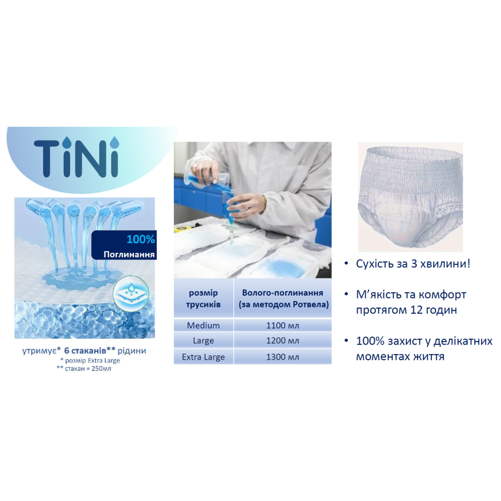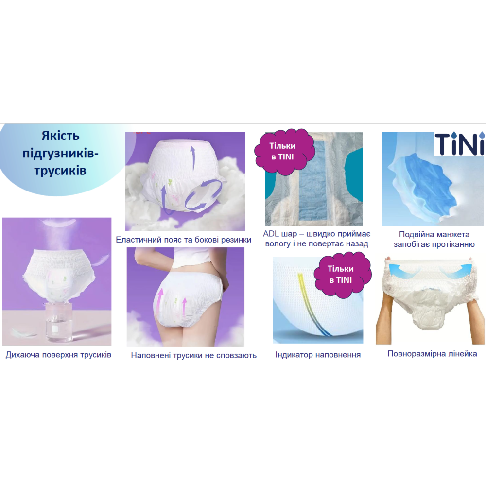 підгузниках-трусиках TINI є додатковий ADL шар, який швидко приймає вологу та не